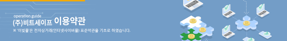 제1조 (목적) 본 약관은 (주)비트세이프가 운영하는 (주)비트세이프 사이버 몰인 ‘이빛몰’(이하 "몰"이라 한다)에서 제공하는 인터넷 관련 서비스(이하"서비스"라 한다)를 이용함에 있어 사이버 몰과 이용자의 권리 · 의무 및 책임사항을 규정함을 목적으로 합니다. 제2조 (정의) 1. "몰" 이란 재화 또는 용역을 이용자에게 제공하기 위하여 컴퓨터 등 정보통신 설비를 이용하여 재화 또는 용역을 거래할 수 있도록 설정한 가상의 영업장을 말합니다. 2. "이용자"란 "몰"에 접속하여 본 약관에 따라 "몰"이 제공하는 서비스를 받는 회원을 말합니다. 3. "회원"이라 함은 ‘이빛몰’을 통하여 회원등록을 한 자로서, "몰"의 정보를 지속적으로 제공받으며, "몰"이 제공하는 서비스를 계속적으로 이용할 수 있는 자를 말합니다. 제3조 (약관의 명시와 개정) 1. "몰"은 이 약관의 내용과 상호, 영업소 소재지, 대표자의 성명, 사업자등록번호, 연락처(전화, 팩스, 전자우편 주소 등)등을 이용자가 알 수 있도록 몰의 초기 서비스화면(전면)에 게시합니다. 2. "몰"은 약관의규제등에관한법률, 전자거래기본법, 전자서명법, 정보통신망이용촉진등에관한법률, 소비자보호법 등 관련법을 위배하지 않는 범위에서 이 약관을 개정할 수 있습니다. 3. "몰"이 약관을 개정할 경우에는 적용일자 및 개정사유를 명시하여 현행약관과 함께 몰의 초기 화면에 그 적용일자 7일이전부터 적용일자 전일까지 공지합니다. 제4조 (서비스의 제공 및 변경) 1. "몰"은 다음과 같은 업무를 수행합니다 2. "몰"은 재화의 품절 또는 기술적 사양의 변경 등의 경우에는 장차 체결되는 계약에 의해 제공할 재화 · 용역의 내용을 변경할 수 있습니다. 이 경우에는 변경된 재화 · 용역의 내용 및 제공일자를 명시하여 현재의 재화 · 용역의 내용을 게시한 곳에 그 제공일자 이전 7일부터 공지합니다. 제5조 (서비스의 중단) 1. "몰"은 컴퓨터 등 정보통신설비의 보수점검 · 교체 및 고장, 통신의 두절 등의 사유가 발생한 경우에는 서비스의 제공을일시적으로 중단할 수 있습니다. 제6조 (회원가입) 1. 회원가입은 (주)비트세이프 윤리규정과 "몰"이 정한 가입 양식에 따라 회원정보를 기입한 후 이 약관에 동의한다는 의사표시를 함으로서 회원가입을 신청합니다. 3. 회원가입의 성립 시기는 "몰"의 승낙이 회원에게 도달한 시점으로 합니다. 제7조 (회원탈퇴) 1. 회원은 "몰"에 언제든지 탈퇴를 요청할 수 있으며 "몰"은 즉시 회원 탈퇴를 처리합니다. 2. 회원이 다음 각 호의 사유에 해당하는 경우, "몰"은 회원자격을 제한 및 정지시킬 수 있습니다. 3. "몰"이 회원 자격을 제한 · 정지 시킨 후 동일한 행위가 2회 이상 반복되거나 30일 이내에 그 사유가 시정되지 아니하는 경우 "몰"은 회원자격을 상실시킬 수 있습니다. 4. "몰"이 회원자격을 상실시키는 경우에는 회원등록을 말소합니다. 이 경우 회원에게 이를 통지하고 회원등록 말소 전에 최소한 7일 이상의 기간을 정하여 소명할 기회를 부여합니다. 제8조 (회원에 대한 통지) 1. "몰"이 회원에 대한 통지를 하는 경우, 회원이 "몰"에 제출한 전자우편 주소로 할 수 있습니다. 제9조 (구매신청) "몰"이용자는 "몰"상에서 이하의 방법에 의하여 구매를 신청합니다. 1. 재화 또는 용역의 검색 및 선택 2. 성명, 주소, 이동전화번호(또는 전화번호) 입력 등의 입력 3. 약관내용, 청약철회권이 제한되는 서비스, 배송료, 설치비 등의 비용 부담과 관련한 내용에 대한 확인 4. 이 약관에 동의한다는 표시(예, 마우스 클릭) 5. 재화 등의 구매신청 및 이에 관한 확인 또는 "몰"의 확인에 대한 동의 6. 결제 암호화폐의 선택 제10조 (계약의 성립) 1. "몰"은 제9조와 같은 구매신청에 대하여 다음 각 호에 해당하지 않는 한 승낙합니다. 제11조 (지급방법) "몰"에서 구매한 재화 또는 용역에 대한 대금지급방법은 다음의 방법 중 가용한 방법으로 할 수 있습니다. 1. “몰”에서 취급하는 모든 암호화폐 2. "몰"이 지급한 포인트(포인트)에 의한 결제 제12조 (수신확인통지, 구매신청 변경 및 취소) 1. "몰"은 이용자의 구매신청이 있는 경우 이용자에게 수신확인통지를 합니다. 2. 수신확인통지를 받은 이용자가 의사표시의 불일치 등이 있는 경우에는 수신확인통지를 받은 후 즉시 구매신청 변경 및 취소를 요청할 수 있습니다. 3. "몰"은 배송 전 이용자의 구매신청 변경 및 취소 요청이 있는 때에는 지체 없이 그 요청에 따라 처리합니다. 제13조 (배송) "몰"은 이용자가 구매한 재화에 대해 배송수단, 수단별 배송비용 부담자, 수단별 배송기간 등을 명시합니다. 만약 "몰"의 고의 · 과실로 약정 배송기간을 초과한 경우에는 그로 인한 이용자의 손해를 배상합니다. 제14조 (환급, 반품 및 교환) 1. "몰"은 이용자가 구매 신청한 재화 또는 용역이 품절 등의 사유로 재화의 인도 또는 용역의 제공을 할 수 없을 때에는 지체 없이 그 사유를 이용자에게 통지하고, 사전에 재화 또는 용역의 대금을 받은 경우에는 대금을 받은 날부터 3영업일 이내에, 그렇지 않은 경우에는 그 사유발생일로부터 3영업일 이내에 계약해제 및 환급절차를 취합니다. 반품 및 환불에 대해선 “몰” 포인